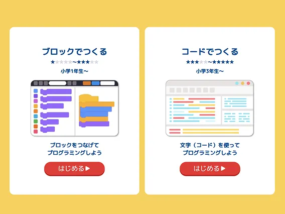 お子さまのレベルに合わせて、2つの学習方法から選べます。ビジュアルプログラミングから始めるのがおすすめ。